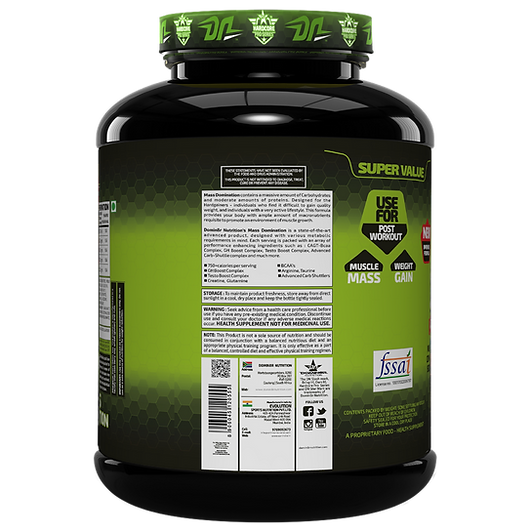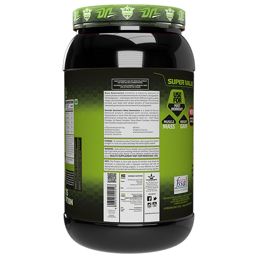 Domin8r Nutrition’s Mass Domination is a state-of-the-art advanced product, designed with various metabolic requirements in mind. Each serving is packed with an array of performance enhancing ingredients such as : CAGT-Bcaa Complex, GH Boost Complex, Testo Boost Complex, Advanced Carb-Shuttle complex and much more.