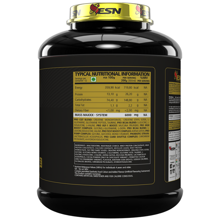 ESN Mass Maxxx is a state-of-the-art advanced product. Each serving is packed with an array of performance-enhancing ingredients such as Pro CGT Complex, Pro Bcaa Complex, Pro GH Boost Complex, Pro-Test Boost, Advanced Carb-Shuttle complex and much more.