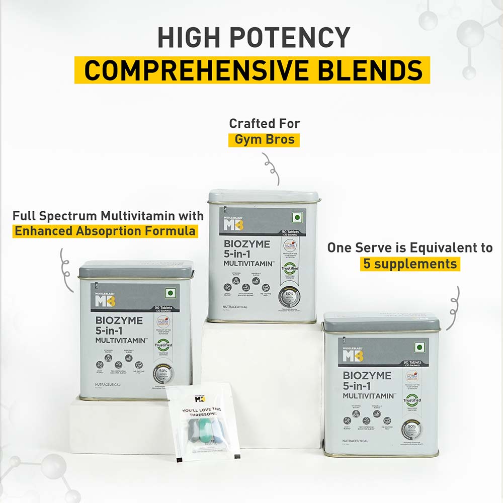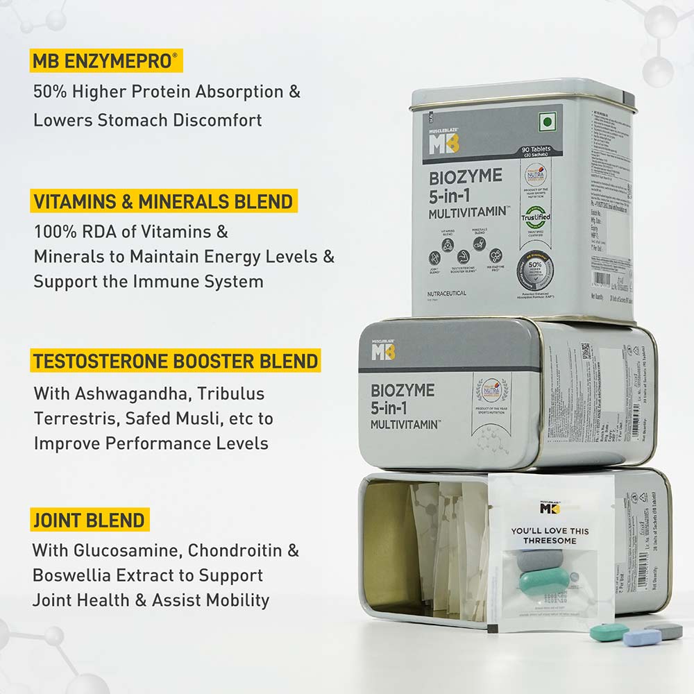 - 1. Power of Biozyme: MuscleBlaze Biozyme 5 in 1 Multivitamin is more than just a multivitamin with our proprietary and clinically tested MB EnzymePro that has Enhanced Absorption Formula(EAF) to ensure 50% higher protein absorption and keep stomach issues miles away