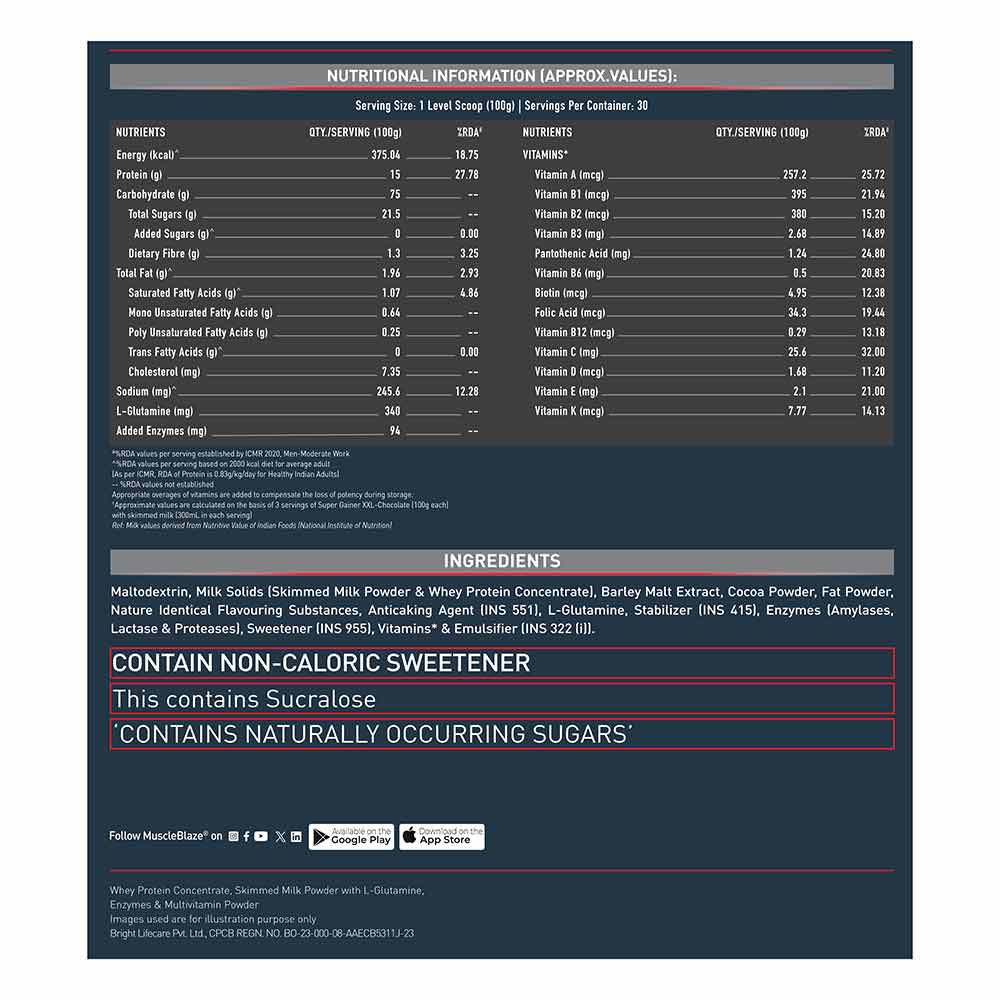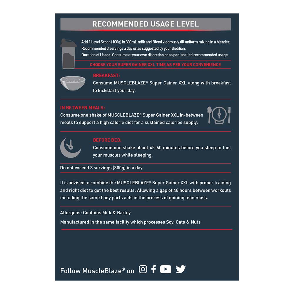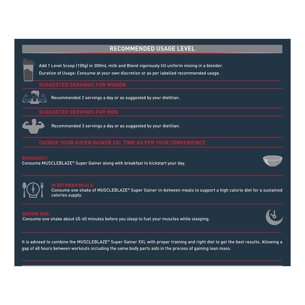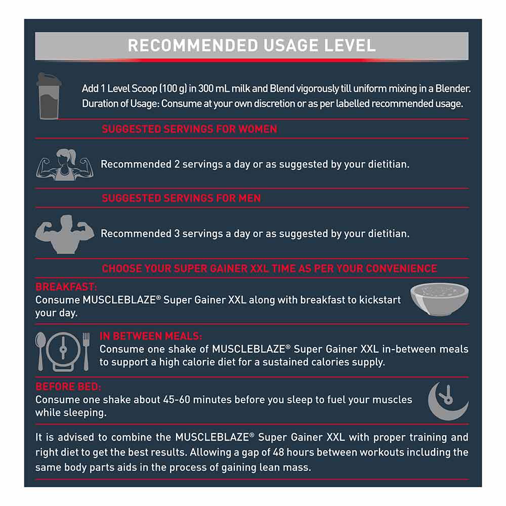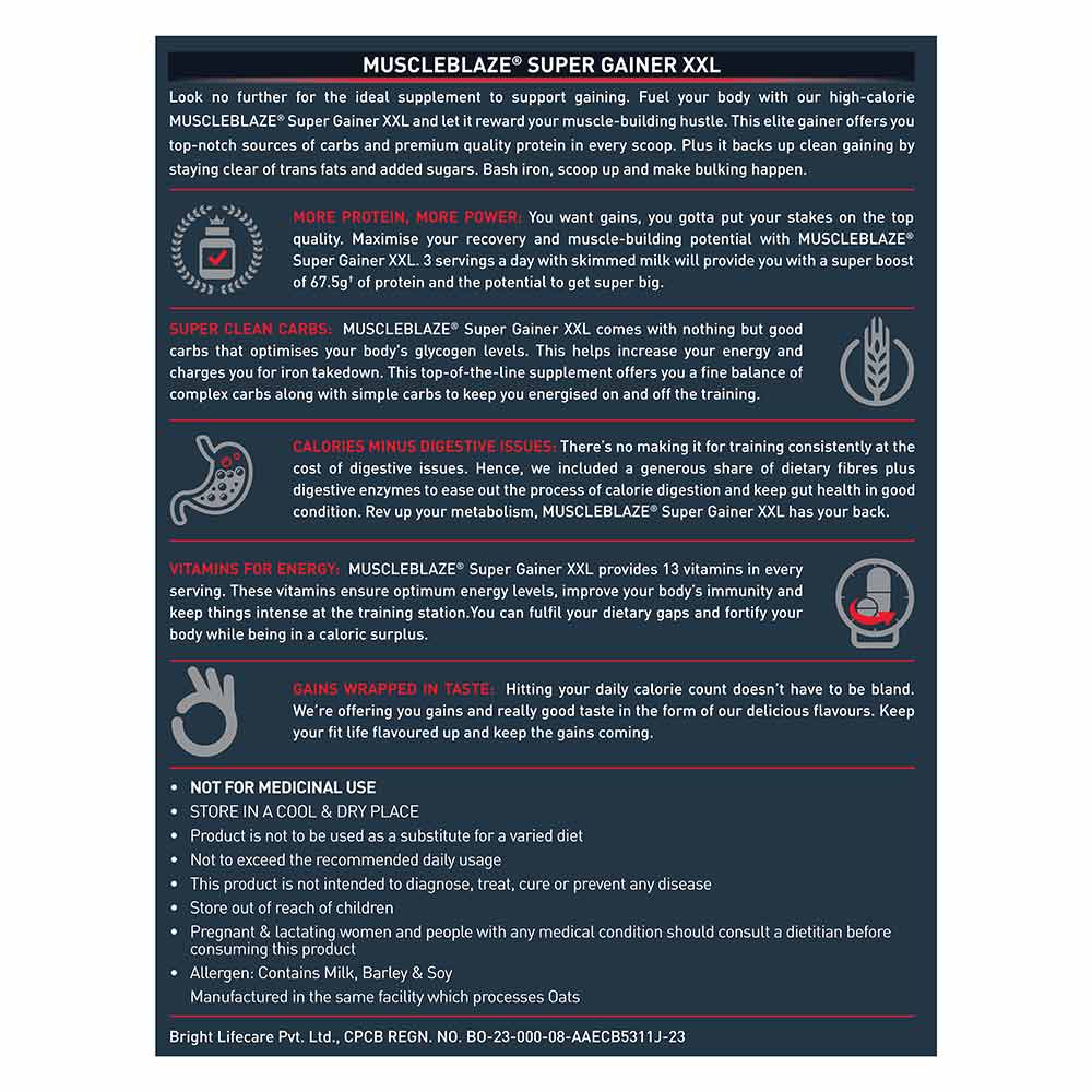 1. MuscleBlaze Super Gainer XXL Chocolate is crafted especially for hardcore fitness enthusiasts who work hard to gain big and sturdy muscles and a sculpted physique
