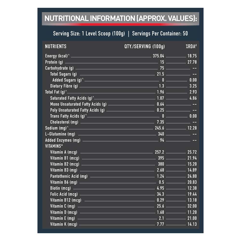 3. It offers 75g of simple and complex carbs per serving of 100g that ensures a robust and sustained calorie release in your body to fuel your muscles for a longer duration